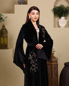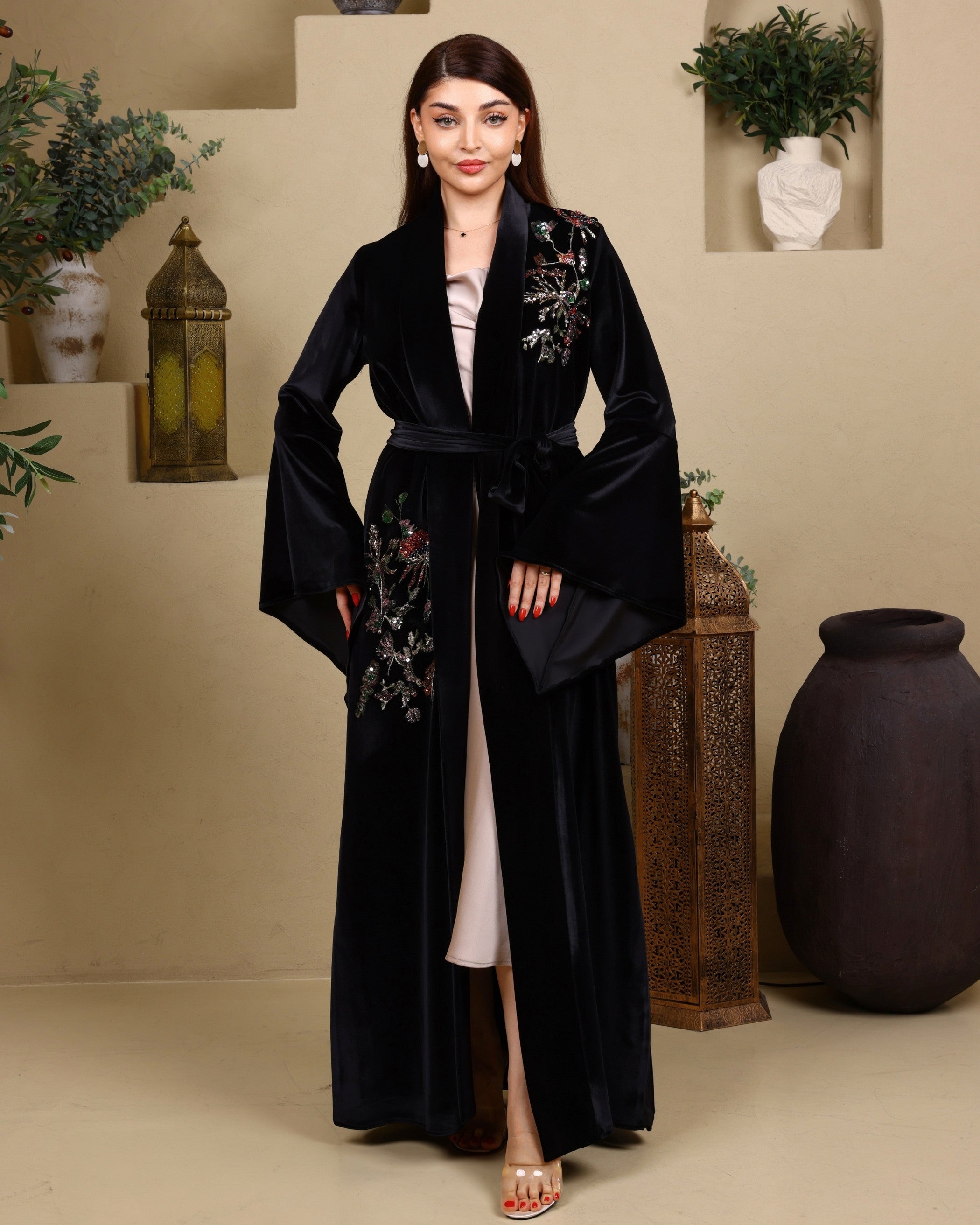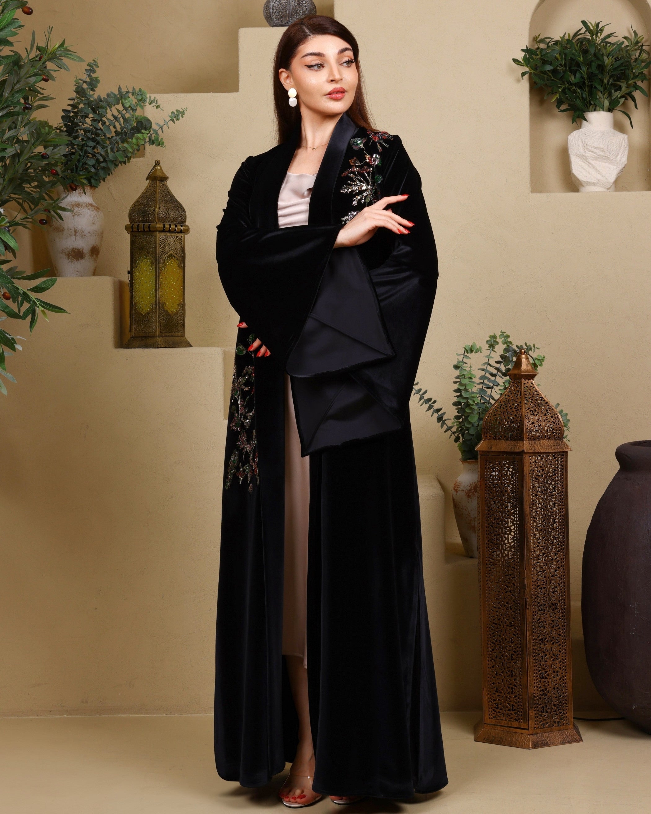 Laylat Al Ward Kimono Abaya is made from rich velvet with a soft, fluid drape. Floral embroidery adds a touch of luxury, while the full-length sleeves, floor-length silhouette, and back detailing create a royal, elegant look. Fully lined for structure, volume, and straight-up sophistication.